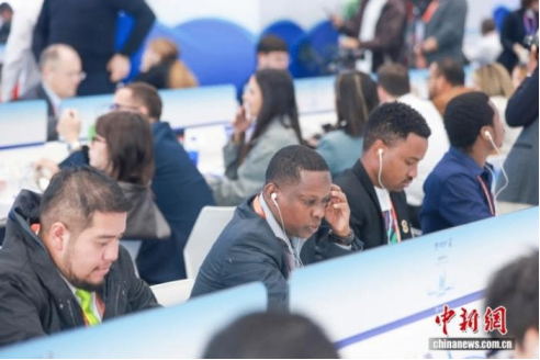 11月5日,第八届中国国际进口博览会暨虹桥国际经济论坛开幕式在国家会展中心(上海)举行。图为外国媒体记者在新闻中心收听开幕式上的嘉宾发言。